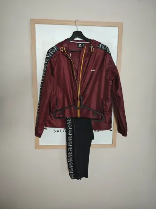 Chaqueta con cremallera completa y capucha. - Logo de la marca bordado en el pecho. - Bolsillos frontales. - Puños y cintura elásticos. - pequeña mancha en el pantalon que no se si se va nunca lo e probado ancho 46 largo 62 pantalones 88