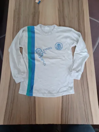 Camiseta de uniforme pureza de maria manga larga talla 6 - Rayas verticales en azul y verde. - Logo del colegio en azul.