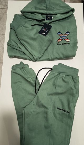 Conjunto de chándal de la marca Blue Banana. -Talla S ( L en verde ) - Diseño con logo X multicolor. - Cordones negros en la capucha. - Tejido suave y cómodo.
