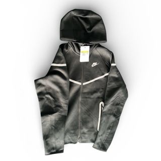 Conjunto deportivo Nike Tech Fleece en color negro con detalles reflectantes. - Sudadera con capucha y cremallera completa. - Pantalón con cordón ajustable en la cintura. - Diseño moderno y cómodo.