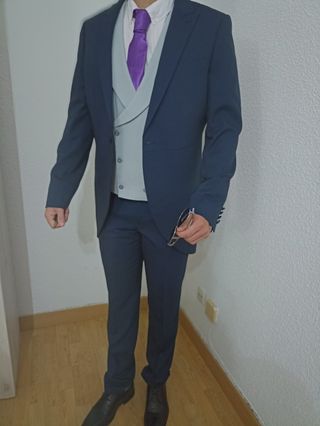 Medio chaqué corte clásico color azul marino.Prácticamente nuevo,solo usado una vez. La chaqueta y los pantalones son de una talla 52.El pantalón tiene un contorno de cintura de aproximadamente 92 centímetros.El pantalon tiene arreglo en los dobladillos .Si necesitas medidas puedo enviar fotos con las medidas qué necesites saber.