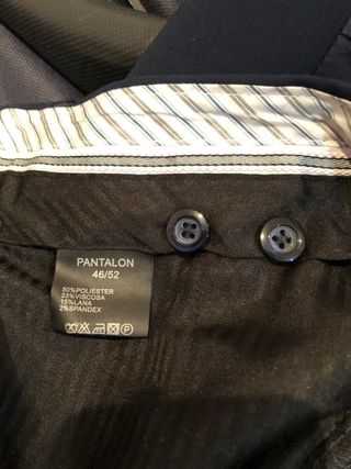 Usado una vez. Talla 42. Pantalón de chaqué de un conjunto de dos piezas. Cuenta con cierre central mediante botón y cremallera, dos bolsillos ribeteados en la cintura y dos bolsillo de ojal con botón en la parte trasera. Forrado en su interior.