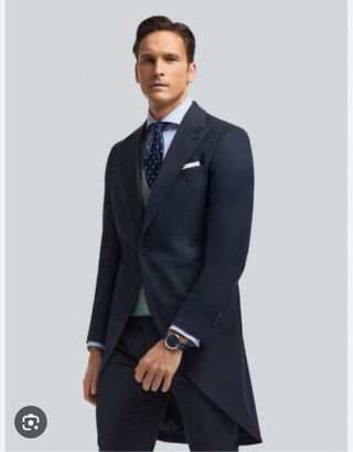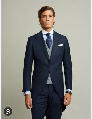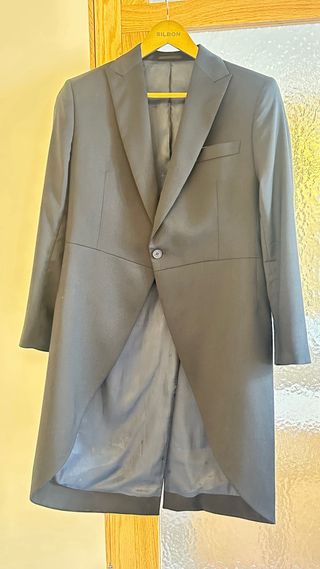 Chaqué de Silbon compuesto por levita + pantalón a rayas, conjunto clásico de ceremonia ideal para novio o padrino. Corte elegante, tejido de alta calidad y silueta estilizada. Talla: (indica la tuya) Color levita: (normalmente azul marino o gris marengo) Pantalón: raya diplomática clásica, tiro cómodo y ajuste slim/regular (según tu modelo) PUESTO EN BODA UNA VEZ