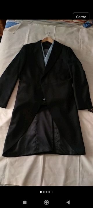 se vende este chaqué completo, compuesto de levita, chaleco negro pantalon y pañuelo blanco. medidas en las fotos. 4 usos.