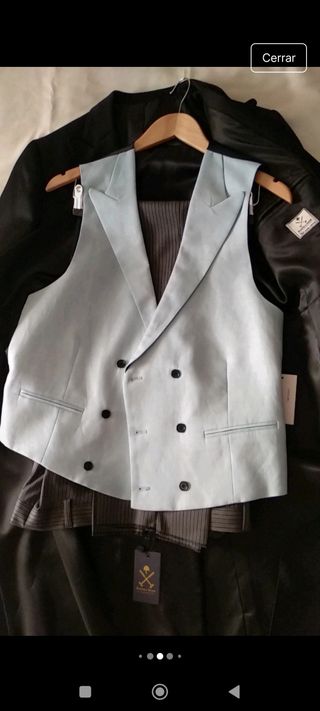 Vendo chaqué clásico que utilizó mi padre para el día de mi boda 😍 Leer bien: Tengo un solo pantalón marca “Roberto Bassi” talla 44 (se puede sacar y meter tanto de cintura como de ruedo) Una levita de la misma marca talla 50 y un chaleco de la misma talla en color azul cielo. He tenido que comprar otra levita porque esa no le quedó a mi padre. Es marca “Arax Gazzo” talla 56, con chaleco gris de dibujos negros (58), corbata y pañuelo. Si te interesa, puedes probarte ambas levitas y ambos chalecos y llevar el que te quede mejor. Vendo TODO por 200€ (pantalón más dos levitas más dos chalecos, uno a juego) un solo traje 150€