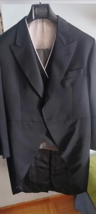 Chaqué negro clásico de lana 100%, de la marca Milano, talla 54. El pantalón es de pinzas, de color gris oscuro con raya negra, tiene dos bolsillos laterales, otro atrás con botón y un bolsillo pequeño en la cintura, medida de cintura 52 cm y de largo 102 cm. El chaleco es gris claro y mide 55 cm de pecho y 67 de largo por delante (por la parte más larga). La levita es negra y mide 48 cm de hombros, el brazo tiene 60 cm y el largo por detrás 116 cm. Tiene funda de tela para guardarlo en el armario. Está limpio de tintorería. SOLO ENVÍOS