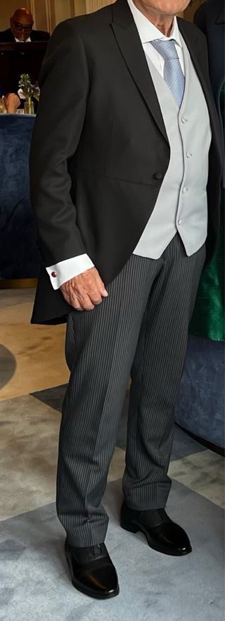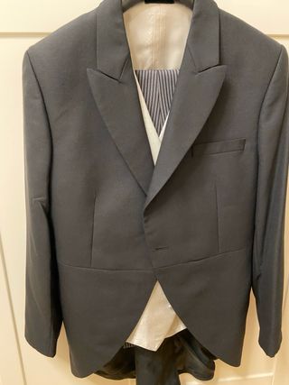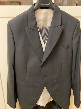 Traje elegante de corte clásico, ideal para eventos formales como bodas. - Chaqué con solapas de pico. - Pantalón de raya diplomática. - Incluye chaleco. Usado una sola vez. Precio nuevo 500€.
