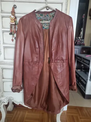 Elegante chaqueta larga de piel con un diseño tipo chaqué. - Material: Piel - Color: Marrón - Corte: Tipo chaqué - Cierre: Cremallera frontal - Forro interior estampado