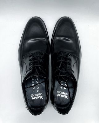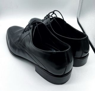 Zapatos piel negros con cordones para traje de chaqué o para bodas. Una vez me los puse para una boda. Sólo tienen una puesta porque, por fortuna, ya no he tenido ninguna boda más en la que tuviera que llevar chaqué. Y, como me inviten a otra, no voy jejejeje. En la última foto está el precio original.