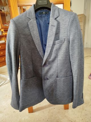 Chaque de vestir azul para joven,con chaleco y tirantes,de hombro a hombro 44 cm largo manga 89 cm y largo pantalón 1,04 cm. Una sola puesta - Diseño elegante con solapas. - Cierre frontal. - Tirantes interiores.