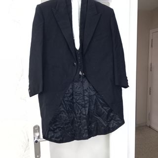 Conjunto de levita, chaqué y chaleco en color negro. La talla es 48. - Levita con corte clásico. - Chaqué con cola. - Chaleco a juego.