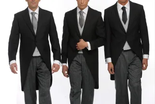Chaqué en tonos negro y gris. Incluye chaqueta, chaleco, pantalones, camisa y corbata