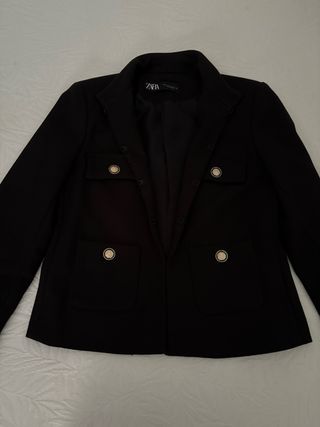 Elegante chaqué de Zara con un diseño sofisticado. - Cuello mao. - Bolsillos de solapa con botón dorado. - Botones dorados decorativos.