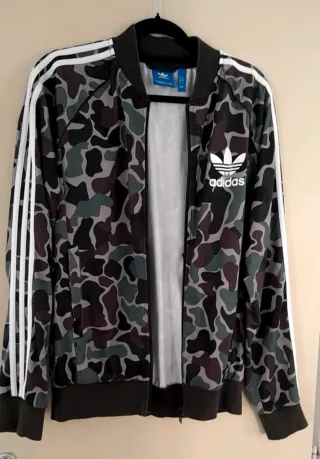 Chaqueta deportiva con estampado de camuflaje y detalles icónicos. - Diseño de camuflaje verde y negro. - Rayas blancas características en las mangas. - Panel frontal blanco con logo de Adidas. - Cremallera completa.