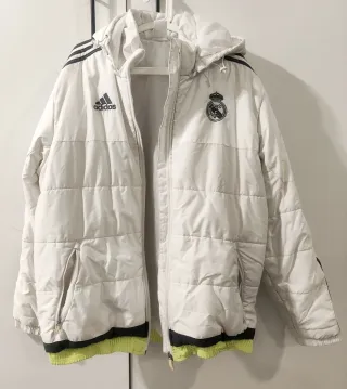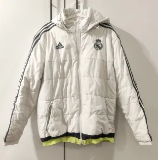 Chaqueta acolchada del Real Madrid con el logo de Adidas. - Diseño acolchado. - Logo de Adidas en el pecho. - Escudo del Real Madrid. - Rayas deportivas en las mangas.