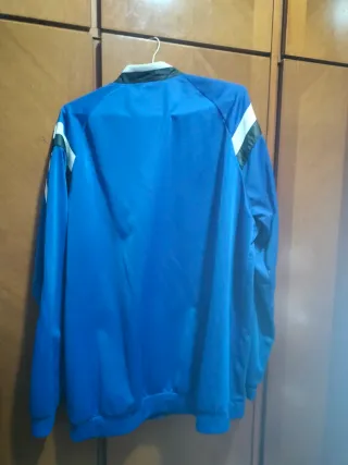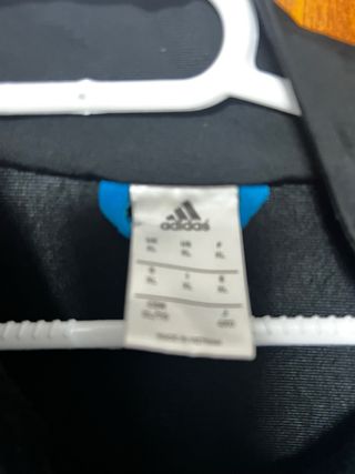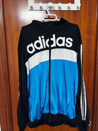 Chaqueta deportiva Adidas con un diseño moderno. - Mangas de color azul. - Detalles de las tres rayas. - Cuello alto. Buen estado solo no se,cerra arriba. Parte collo sino resto muy bien estado