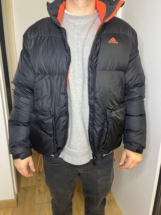 Chaqueta acolchada de Adidas para hombre, con un diseño moderno y detalles en naranja. - Cierre de cremallera frontal. - Bolsillos laterales con cremallera. - Puños ajustables. - Forro interior naranja.