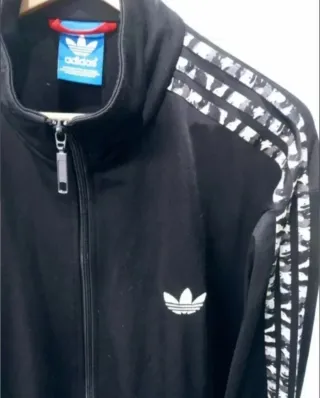 Chaqueta deportiva Adidas con un diseño vibrante y llamativo. - Estampado de logos y emblemas de Adidas. - Cuello redondo y cierre de cremallera. - Puños y bajo elásticos. Falta el gancho de la cremallera. Se puede areglar