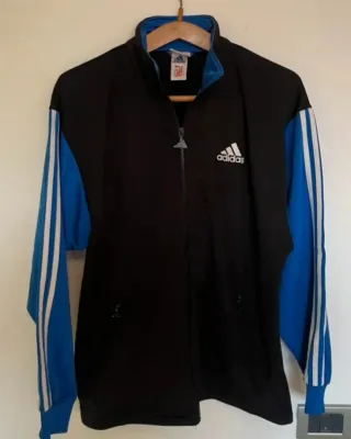 Chaqueta deportiva Adidas vintage – Excepcional bicolor azul marino y plateado Chaqueta deportiva Adidas clásica en excelente estado vintage. Presenta las icónicas 3 bandas en las mangas, cremallera completa y el logotipo de Adidas bordado en el pecho. Ajuste cómodo con un forro interior suave y puños y bajo acanalados. Detalles: Talla: M (EU 40/42) Color: Azul marino y plateado Sin defectos importantes; desgaste vintage normal