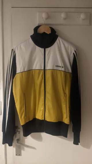 Chaqueta deportiva Adidas con un diseño llamativo en bloques de color. - Paneles blancos en la parte superior. - Zona central en amarillo vibrante. - Mangas y cuello en negro. - Detalle de las tres rayas icónicas en las mangas.