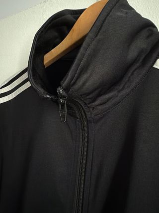 Chaqueta deportiva clásica de Adidas. - Diseño con las icónicas tres rayas blancas en las mangas. - Logo de Adidas bordado en el pecho. - Cierre de cremallera frontal. - Cuello alto.