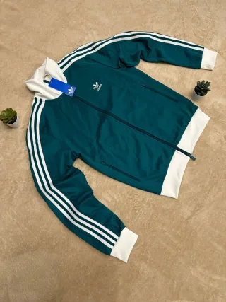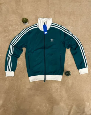 Chaqueta deportiva Adidas de corte clásico y estilo vintage. Presenta un llamativo color verde azulado con detalles en blanco. - Diseño con las icónicas tres rayas en las mangas. - Cuello y puños en contraste blanco. - Cremallera frontal completa. - Bolsillos laterales con cremallera.