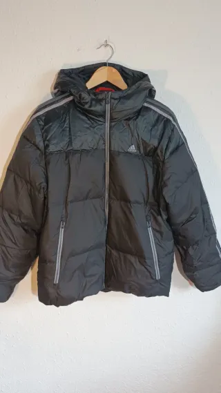 Chaqueta acolchada Adidas con diseño deportivo,relleno de plumón. Está nueva. - Capucha integrada. - Cierre de cremallera frontal. - Bolsillos laterales con cremallera. - Detalles de rayas en las mangas y hombros.