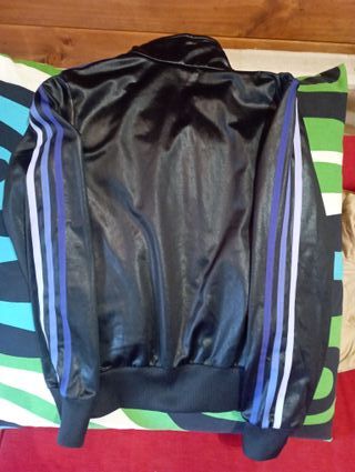 Chaqueta deportiva clásica de Adidas. - Diseño con las icónicas tres rayas en las mangas. - Logo de Adidas bordado en el pecho. - Cierre de cremallera frontal. - Cuello redondo y puños elásticos.