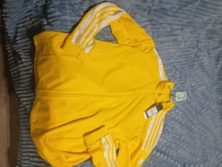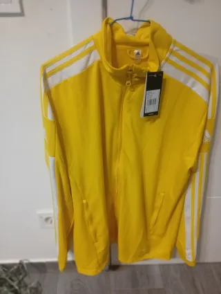 Conjunto deportivo Adidas de chaqueta y pantalón. - Chaqueta con cremallera frontal. - Pantalón con cintura elástica. - Diseño con detalles en amarillo y las icónicas tres rayas. *talla grande como una XL, fíjate en la etiqueta