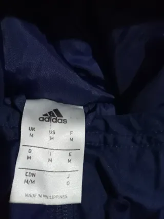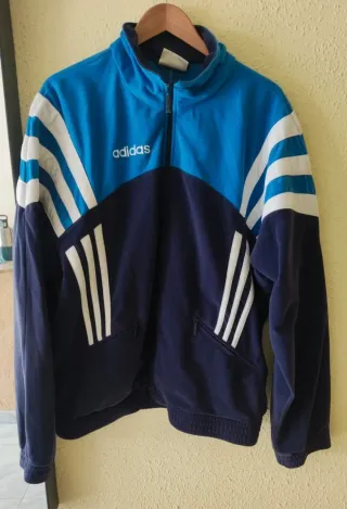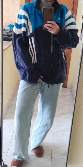 Chaqueta deportiva estilo retro de Adidas. - Diseño con bloques de color azul y blanco. - Logo de Adidas en el pecho. - Cremallera frontal. - Puños y cintura elásticos. Tiene solo una pequeña muesca, por lo demás perfecta. Es muy amplia.
