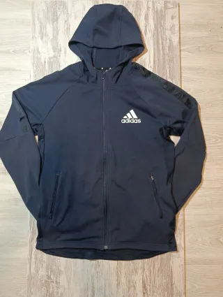 Sudadera deportiva de Adidas en color azul. Cierre completo con cremallera. Cuello alto. Puños y cintura elásticos. Logo de Adidas en el pecho. Usada 3 veces. Talla S. Chaqueta chandal.