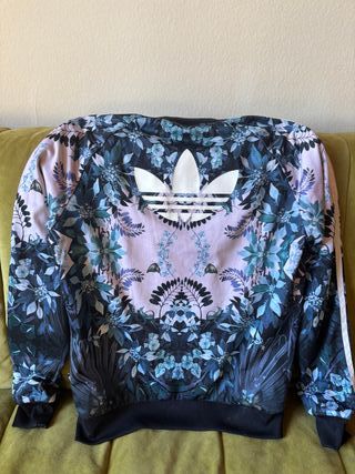 Chaqueta deportiva Adidas con un llamativo estampado floral. - Diseño con cuello redondo y cierre de cremallera. - Puños y bajo elásticos. - Tres rayas características en las mangas.
