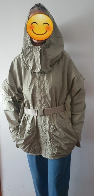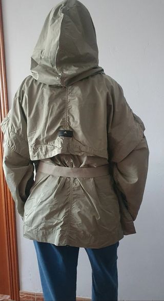 Cazadora tipo cortavientos Marca Adidas Stella McCartney Talla 40(L/M), yo soy una S y tampoco queda mal Tela no muy finita , tipo microbiana Color verde griseado, muy bonito Ajustable a la cintura, mediante cinturón elastico Bolsillos de gran tamaño con volumen,sierre mediante cremallera Capucha de gran tamaño, ajustable Usado poco, por cambio de talla, muy buen estado Se entrega lavado