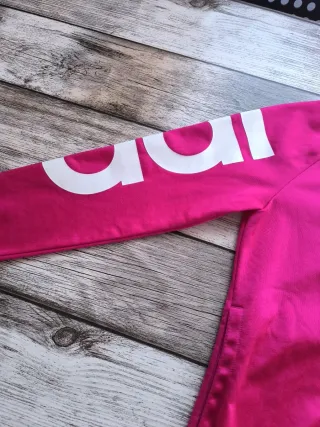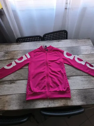 Chaqueta deportiva Adidas en color rosa en perfecto estado como se puede ver. - Diseño con cremallera frontal completa. - Puños y cintura elásticos. - Logo grande en contraste en ambas mangas.