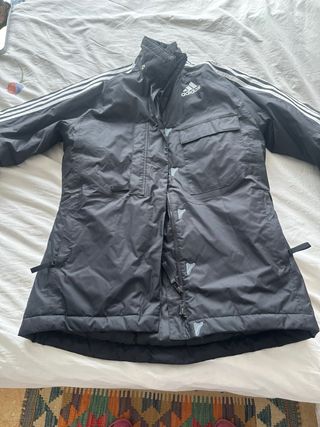 Chaqueta acolchada de la marca Adidas en color gris. Cuenta con capucha y cierre de cremallera. Me la han regalado pero no me queda para un hombre L viene bien o una mujer que sea XL también - Diseño acolchado. - Tres rayas blancas en las mangas. - Logo de Adidas en el pecho. -Totalmente nueva
