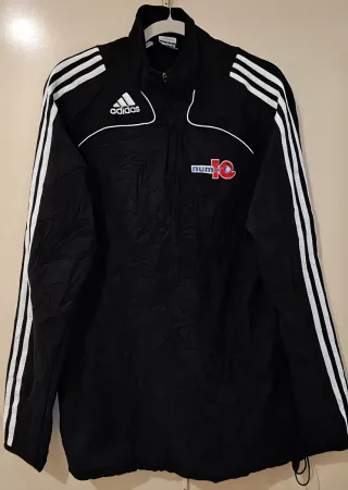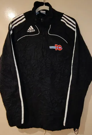 Chaqueta deportiva vintage de la marca Adidas. Apto para hombre y mujer también unisex. Tejido tela no muy gruesa termino medio. Medidas aproximadamente de axila a axila: 54cm y dé ancho de hombros y largo: 43/77cm. En la parte inferior tiene para ajustar... " Como nuevo" - Diseño con cremallera parcial. - Detalles de las tres rayas blancas en las mangas. - Logo de Adidas y number 10 en el pecho.