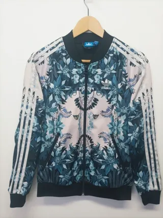 Chaqueta deportiva Adidas con un llamativo estampado floral. - Diseño con las icónicas tres rayas en las mangas. - Cremallera frontal completa. - Cuello alto. - Puños y cintura elásticos.