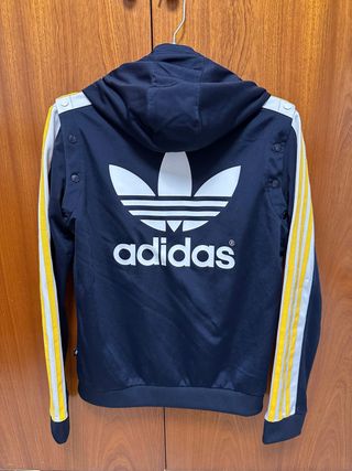 Chaqueta deportiva con capucha y detalles icónicos de Adidas. - Diseño con las tres rayas en las mangas. - Logo grande de Adidas en la espalda. - Cierre de botones a presión en los laterales. Se pueden quitar las mangas y hacerlo chaleco