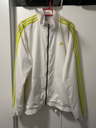 Chaqueta deportiva de la marca Adidas. Tiene la cremallera rota y un pequeño agujero en el puño.