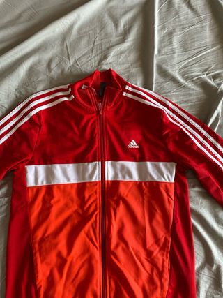 Chaqueta deportiva Adidas con un diseño moderno y cómodo. - Material suave y agradable al tacto. - Detalle de rayas en color rojoy blanco en las mangas. - Logo de Adidas bordado en el pecho.