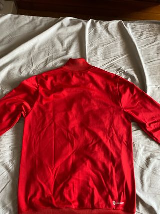 Chaqueta deportiva Adidas en color rojo, con el icónico diseño de tres rayas blancas en las mangas. - Cierre completo con cremallera. - Cuello alto. - Logo de Adidas bordado en el pecho.