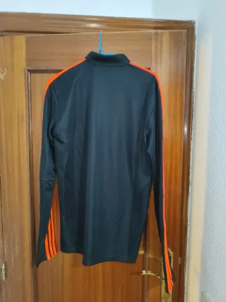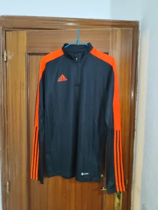 Chaqueta deportiva de manga larga con detalles en naranja. - Cuello redondo con cremallera. - Diseño con las tres bandas características de Adidas en las mangas. - Logo de Adidas en el pecho.