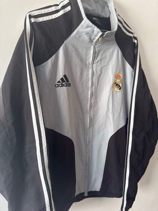 Chaqueta deportiva Adidas del Real Madrid de la temporada 2004. - Diseño con paneles en gris y negro. - Detalles de las tres rayas de Adidas en las mangas. - Escudo del Real Madrid bordado en el pecho.