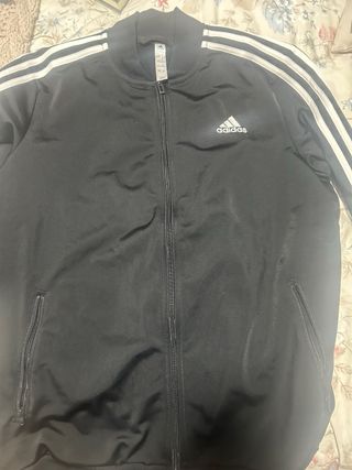 Chaqueta deportiva Adidas en color negro con el icónico diseño de tres rayas blancas en las mangas. - Cierre de cremallera frontal. - Cuello alto. - Bolsillos laterales. Precio negociable