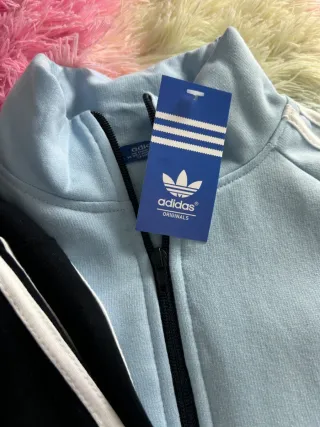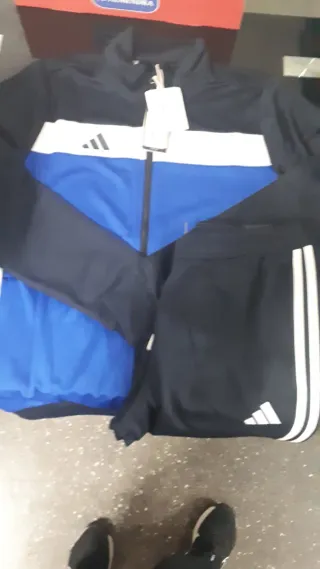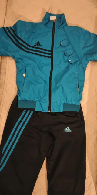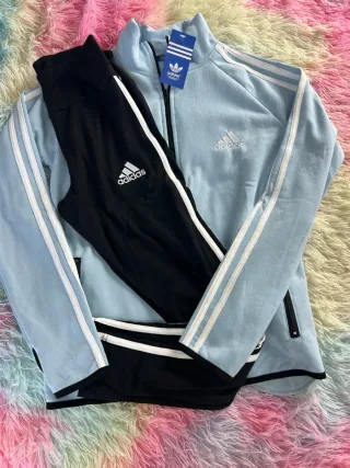 Conjunto deportivo Adidas de dos piezas. - Chaqueta azul con detalles negros. - Pantalón negro con detalles azules. -Remaches con forma de corazón.💙