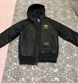 Chaqueta deportiva Adidas color negro con detalle de logo dorado. Logo de Adidas bordado en dorado en el pecho. Cremallera frontal. Bolsillos con cremallera en el lateral. Más info en las fotos Es preciosa, la vendo porque me está pequeña.