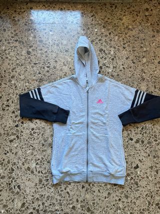 Chaqueta deportiva original Adidas de color gris. Talla L. Precio negociable. - Diseño con detalles en negro y azul. - Cierre completo con cremallera y cuello alto. - Tiene alguna mancha y un agujero quemado.