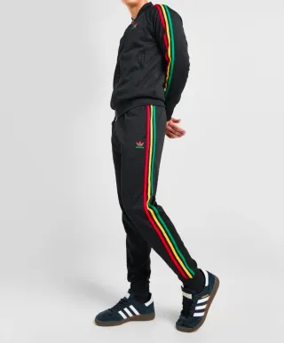 Conjunto deportivo Adidas de dos piezas. - Chaqueta con cremallera completa. - Pantalón con cintura elástica. - Diseño con rayas laterales en rojo, amarillo y verde.