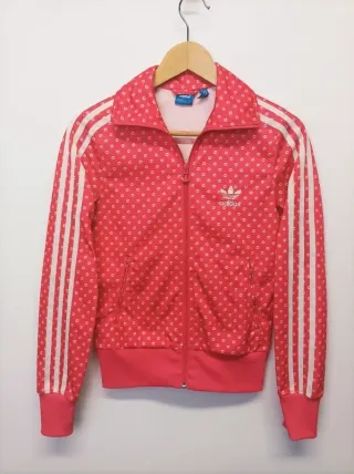 Chaqueta deportiva Adidas Originals con un divertido estampado de lunares. - Diseño Firebird. - Cuello alto. - Puños y cintura elásticos. - Tres rayas icónicas en las mangas. 🏷️ Talla en etiqueta: 34 EU. ⚠️ MEDIDAS ⚠️ ↕️ 57 cms largo ↔️ 43 cms sisa ↕️ 71 cms largo de manga 🔎 Leves señales de uso que se aprecian en las fotos. 🧽 Prenda lavada y planchada. 🔬 Poliéster.