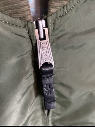 Puños con roces goma cintura bien falta el tirador de la cremallera Chaqueta Alpha Industries con bordado en la espalda. Ideal para niños. Talla l niño talla 10 12 13 14 depende del niño - Diseño clásico. - Cierre de cremallera. - Puños y cintura elásticos.